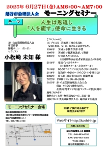 次回、6月20日 第2,056回 経営者モーニングセミナーは、 さいたま美園倫理法人会 専任幹事 移動サロン ポレポレ セラピスト 小松崎 未知 様 テーマ:『人生は恩返し「人を癒す」使命に生きる』 です。